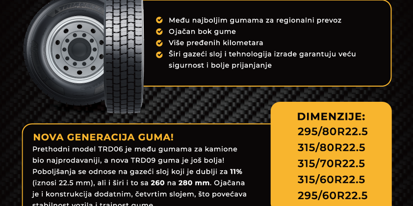 - TR697 – je prikolična guma koja nudi odlično bočno prianjanje i duži vijek trajanja. Namjena je za teže uslove rada na pogonskoj osovini i poluprikolici.