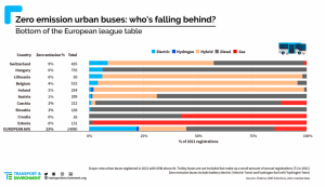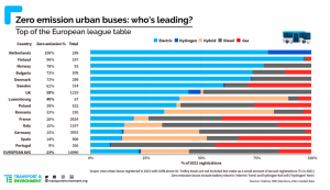 Godine 2021. svi novi urbani autobusi registrovani u Holandiji bili su nulta emisija. Druge zemlje sustižu, prije svega Bugarsku, Dansku i Finsku, koje su sve zabilježile stope raspoređivanja električnih autobusa od više od 70% prošle godine.