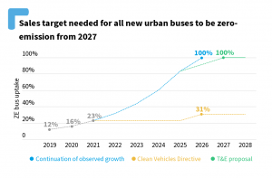 Zalažemo se za 100% prodajni cilj za urbane autobuse nulte emisije u 2027. To bi stavili Evropu na sličnu teritoriju Kaliforniji gdje svi novi urbani autobusi moraju biti nulta emisija iz 2029.